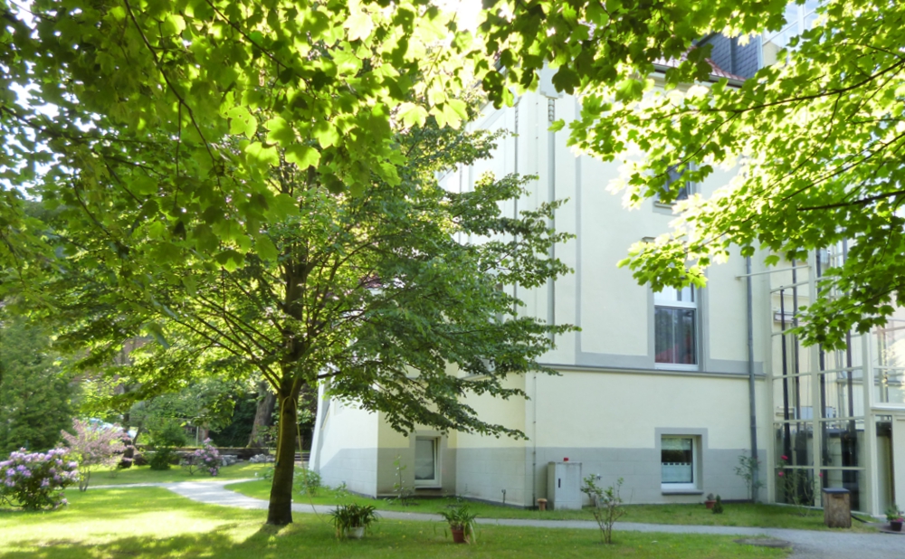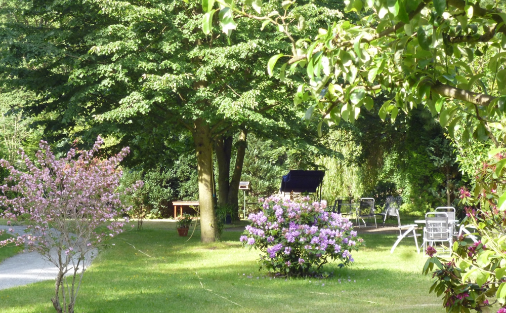 Die Parkanlage der "Spree Villa" ist von großen Bäumen, die im Sommer schönen Schatten spenden, geprägt.